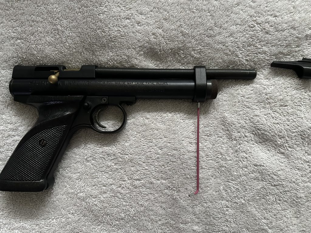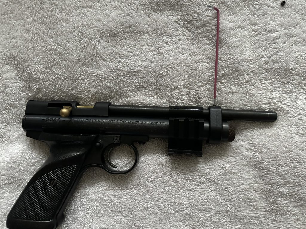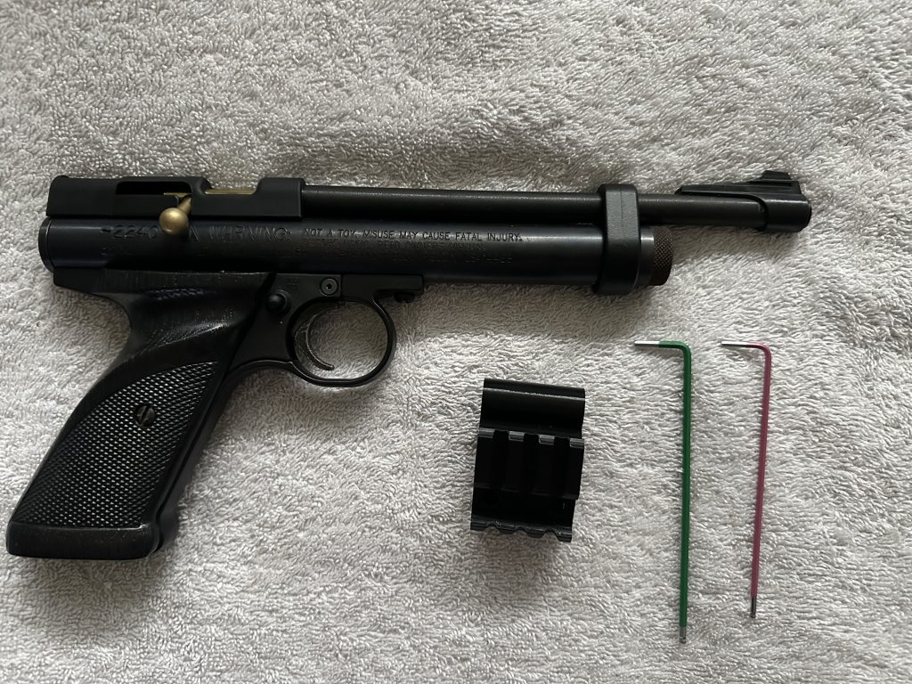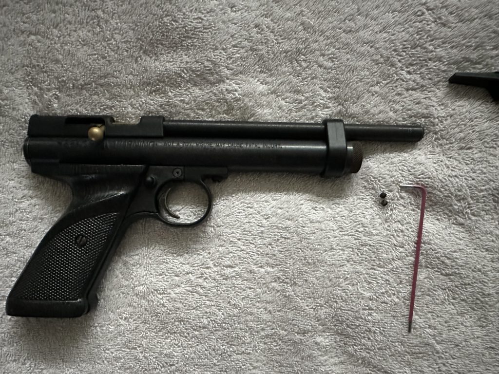 Simply slide the attachment onto your Crosman I would recommend flipping the pistol itself so you can line up the attachment with the line that goes through the screw pictured above.